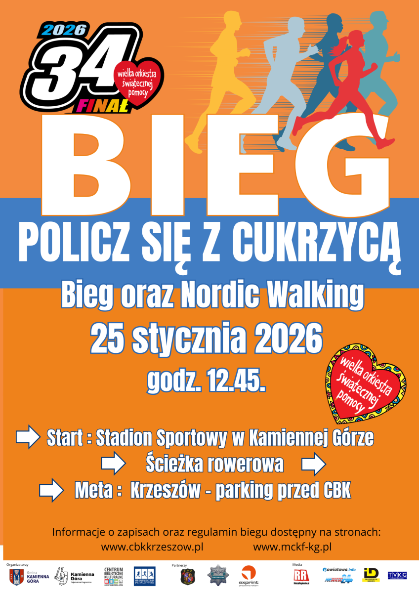 Serdecznie zapraszamy do udziału w 4. biegu „Policz się z cukrzycą”, organizowanym w ramach 34. Finału Wielkiej Orkiestry Świątecznej Pomocy.