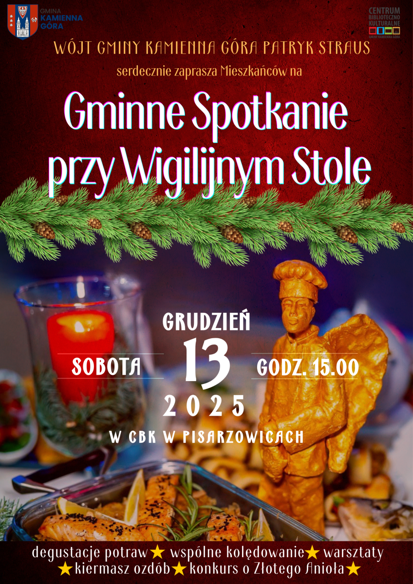 Wójt Gminy Kamienna Góra Patryk Straus oraz Centrum Biblioteczno-Kulturalne Gminy Kamienna Góra serdecznie zapraszają do Pisarzowic w sobotę, 13 grudnia 2025 roku na Gminne Spotkanie przy Wigilijnym Stole.